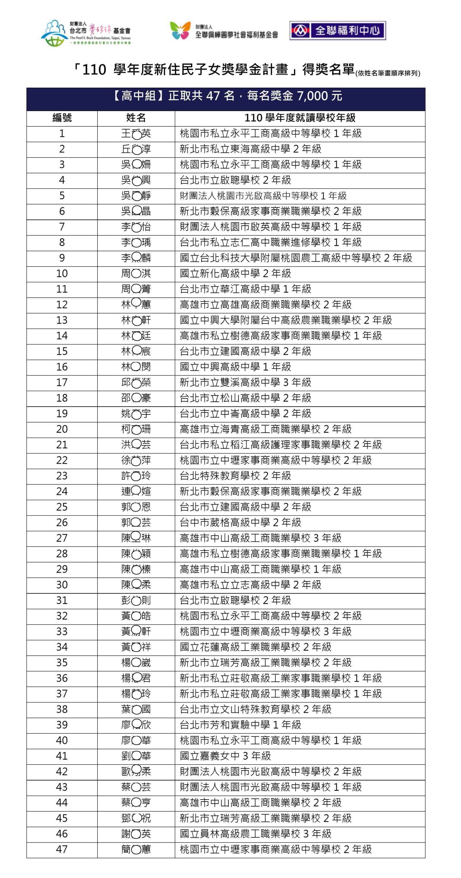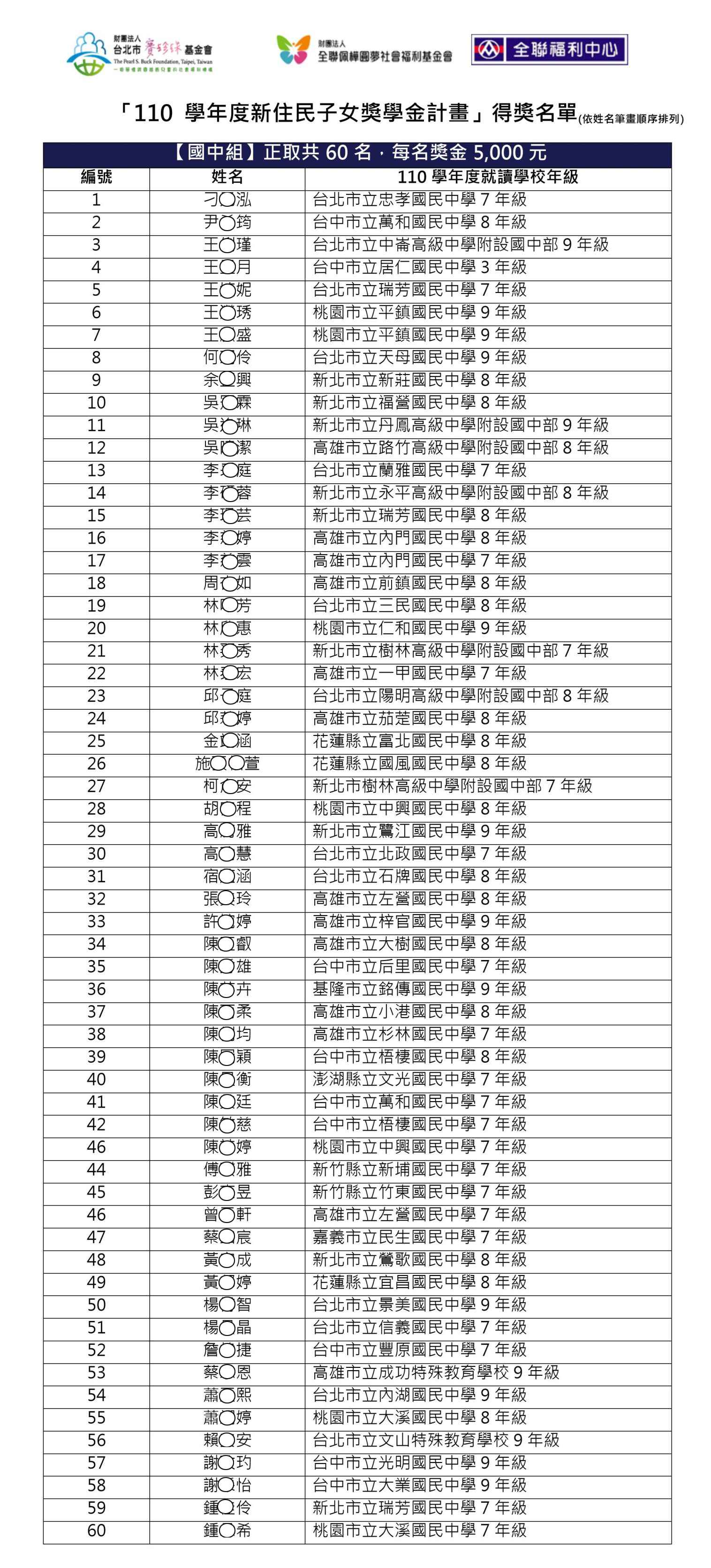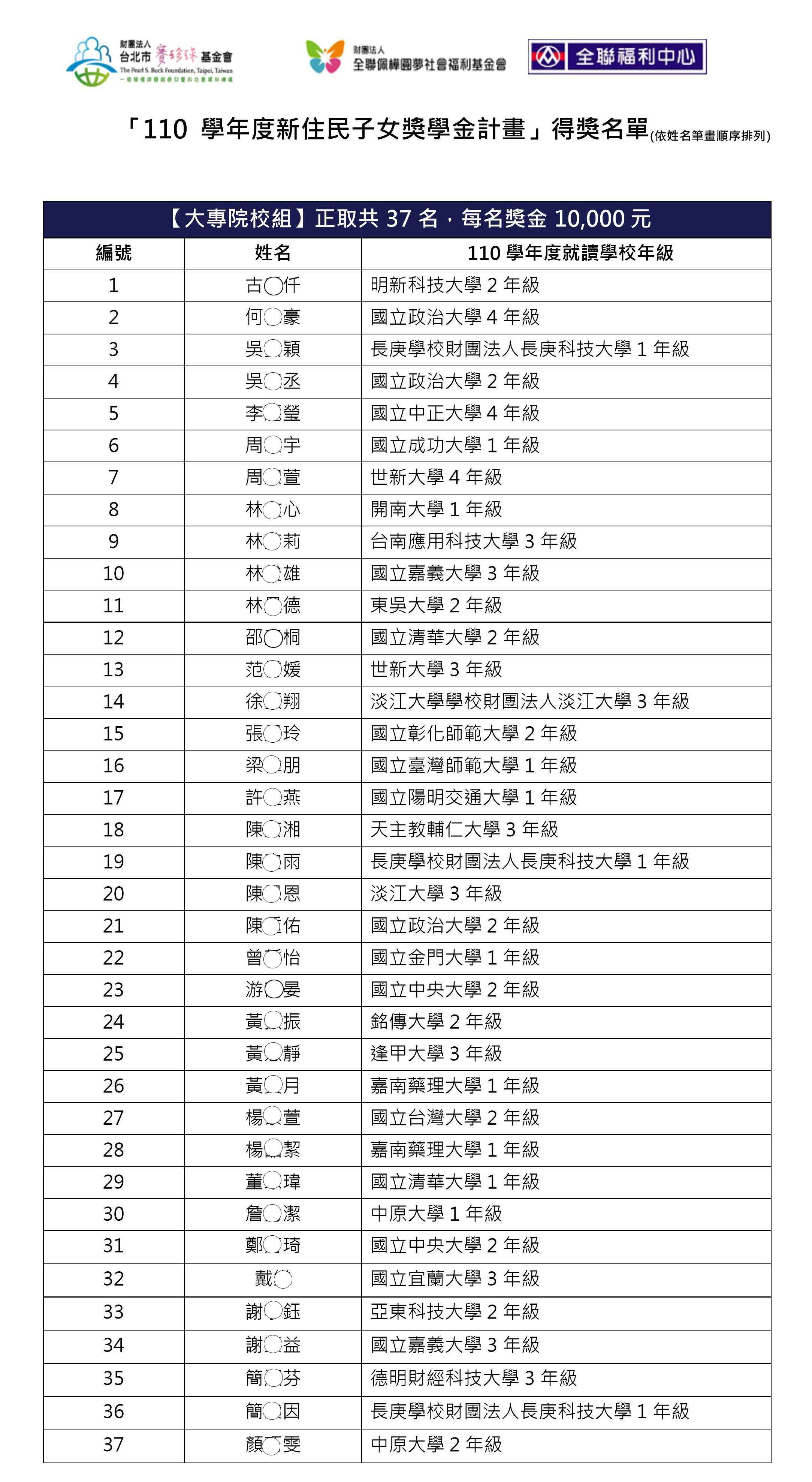 【公告】「110學年度新住民子女獎學金」 得獎名單